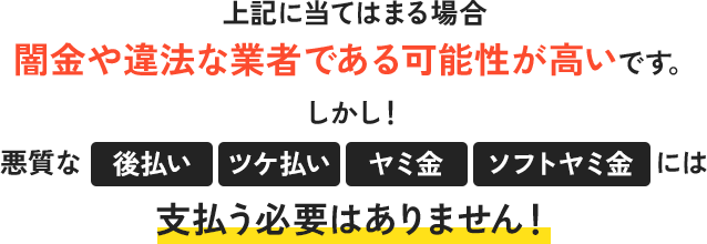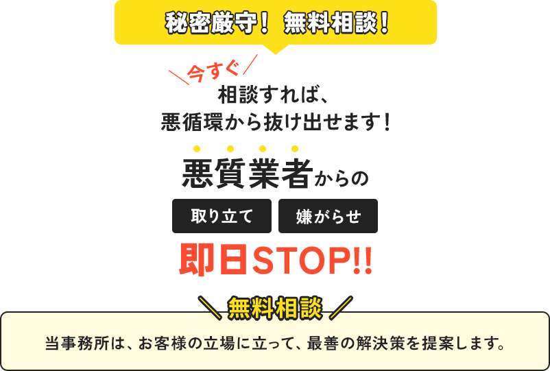 闇金に対して専門的に対応してきた弁護士が適切な解決策をご提案させていただきます。